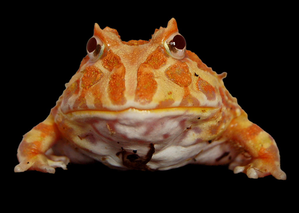 Horned frogs are very lazy frogs with a big mouth and appetite to follow. They will sit all day waiting to find a big dinner. They can sometimes grow up to 6" across!
