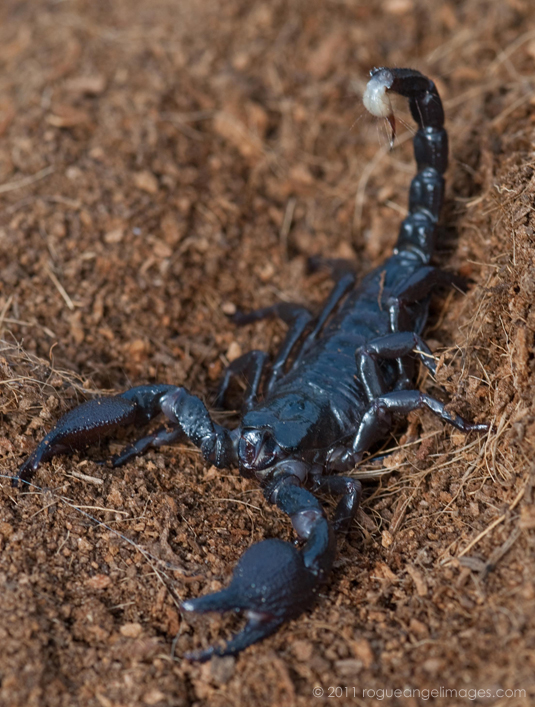 Emperor scorpions are one of the largest species in the world, reaching nearly 8" in the forests of Africa. Normally they are black, however under a UV light they glow a bright green/blue!